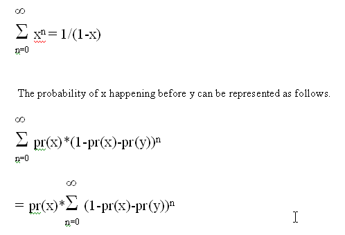 Many bets in craps take more than one role to evaluate. For example the Place 4 bets wins if a 4 is rolled before a 7. Let’s consider the general case of two possible outcomes x and y of an event. The probability of x shall be denoted as pr(x) and the probability of y as pr(y). Please take the following on faith.